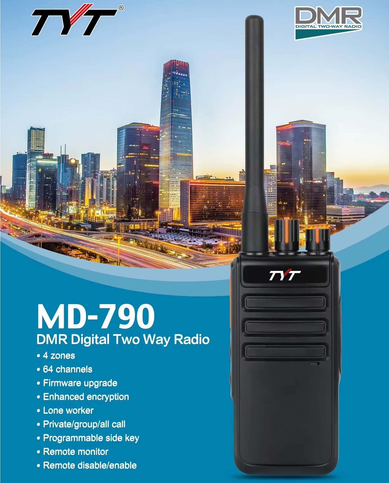 TYT MD790 radiotelefon na zakres UHF, mozna zaprogramować czestotliwości w zakresie 400-470MHz, z maksymalną mocą 5W. Bez wyświetlacza, użytkownik dostaje narzędzie do porozumiewania się, bez konieczności nauki zawiłości telekomunikacyjnych. Urzadzenie działa zarówno w trybie cyfrowym jak i analogowym. Obsługuje DMR 2 slot, więc działa tak że w jednym kanale można prowadzić 2 łączności naraz. W pełni kompatybilne z MOTRBO TIER I i II.